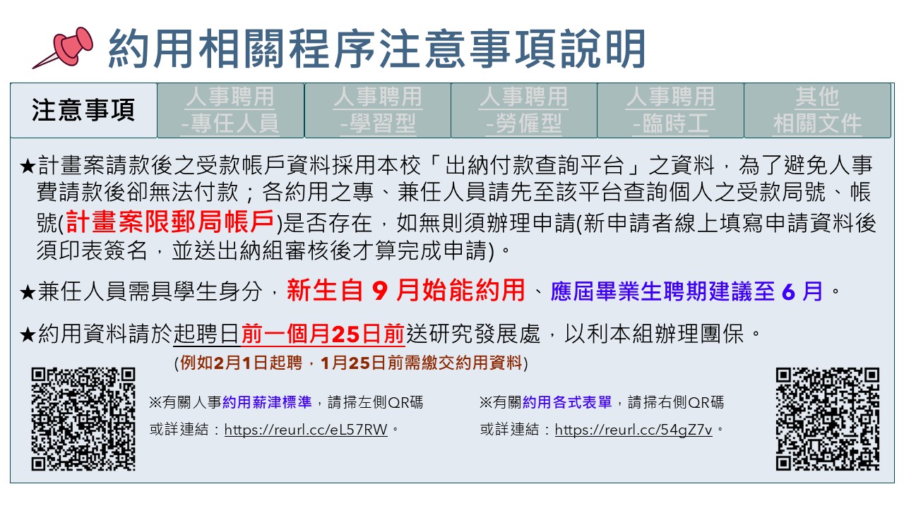 3.人事部分如有任何異動(聘期、薪津),請於每月25日前由主持人通知研發處承辦人員並重送 約用相關資料,以便次月辦理更正。